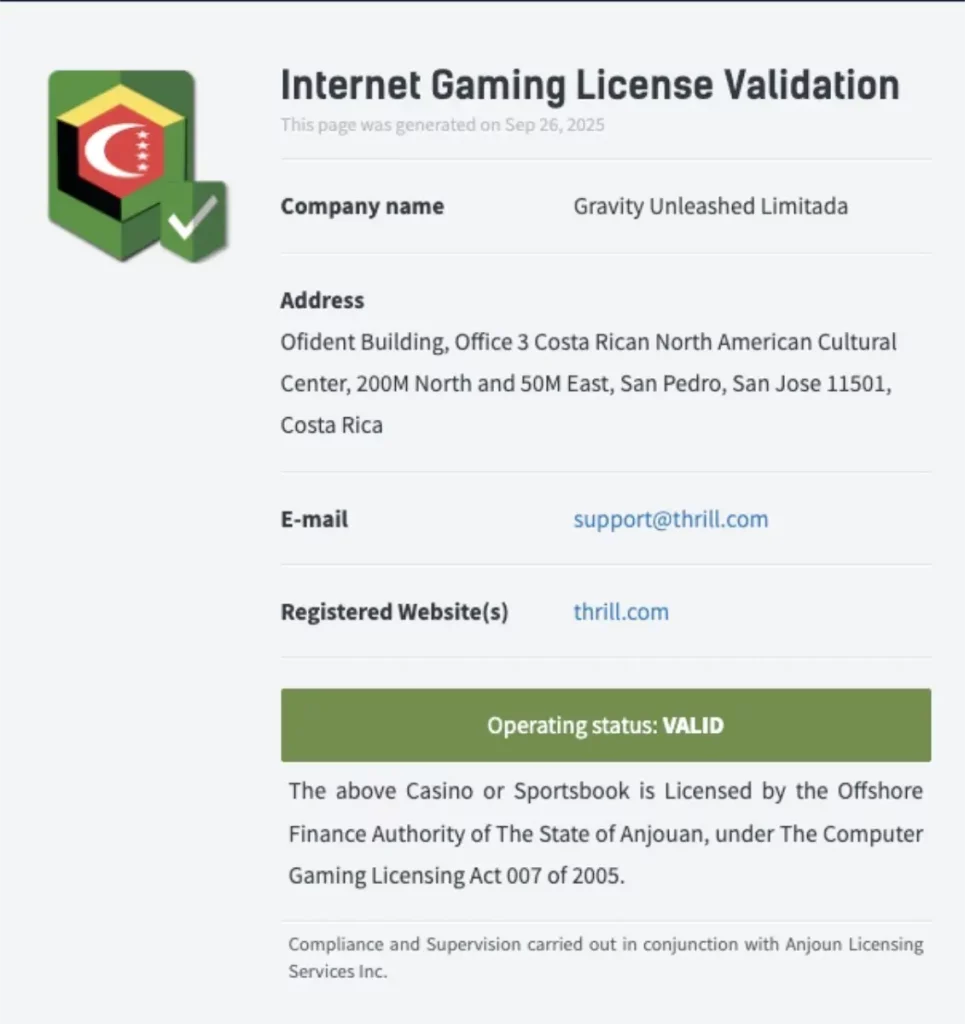 As for the legitimacy, Thrill owns an Anjouan license. That’s a solid sign, as it means the casino is operating under an official gaming framework with rules around fairness, KYC, and player protection.